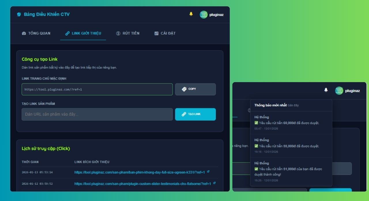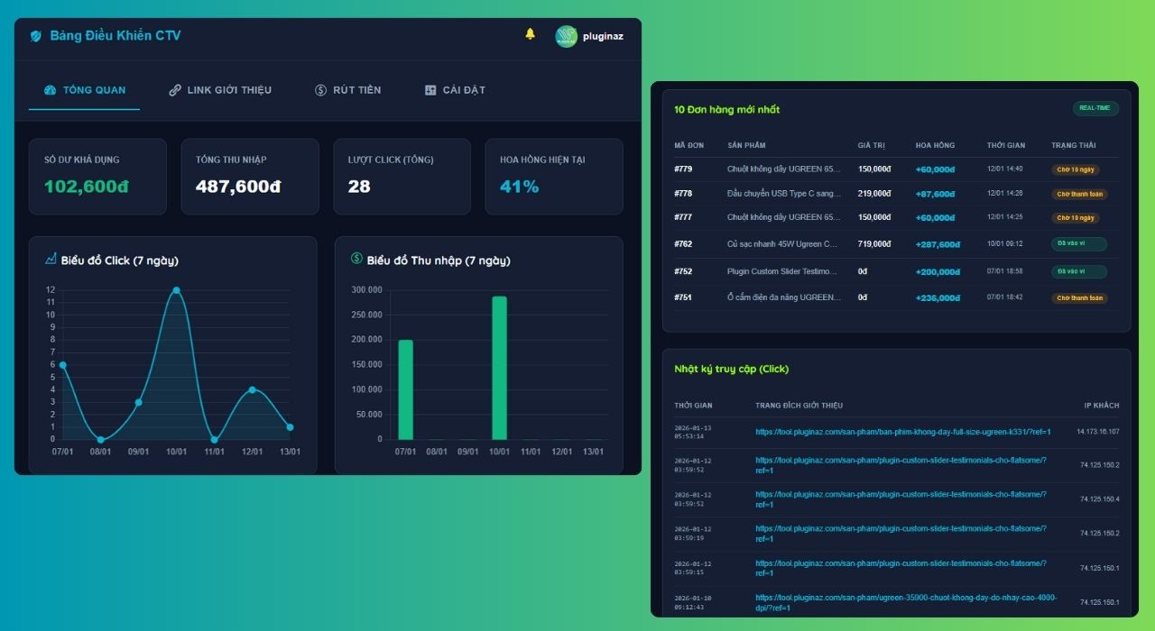 Mỗi cộng tác viên khi tham gia hệ thống sẽ có Dashboard riêng, nơi họ có thể xem link affiliate, lượt click, đơn hàng phát sinh và số tiền hoa hồng nhận được. Giao diện được thiết kế đơn giản, hiện đại và dễ sử dụng, giúp CTV theo dõi thu nhập và chủ động quảng bá sản phẩm hiệu quả hơn.